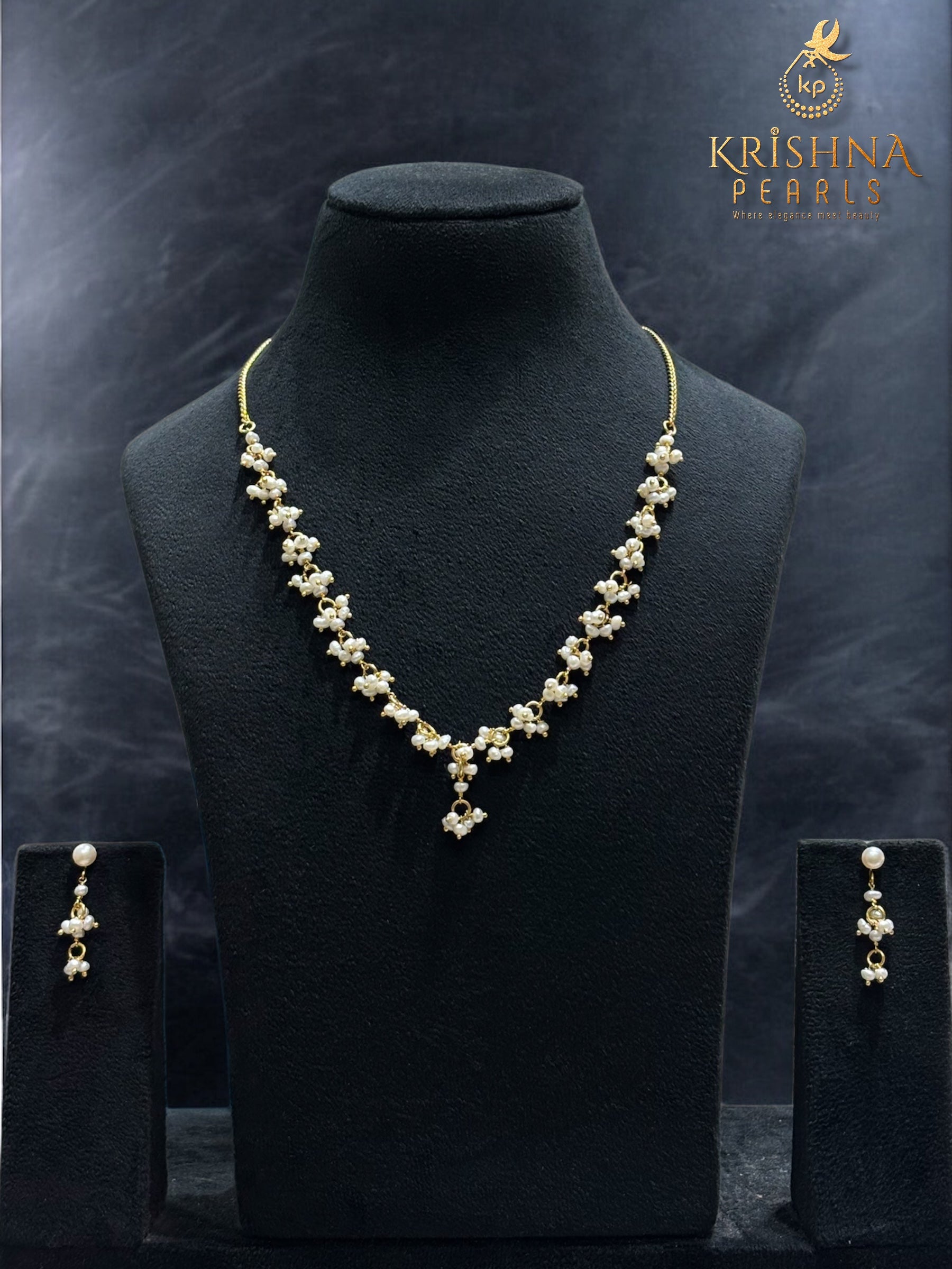 Embrace the legendary craftsmanship of Hyderabad with this exquisite Pearl Necklace Set from Sri Krishna Pearls. Designed for the woman who appreciates subtle luxury, this set features meticulously hand-strung clusters of high-luster white pearls that mimic the delicate beauty of a blooming vine.